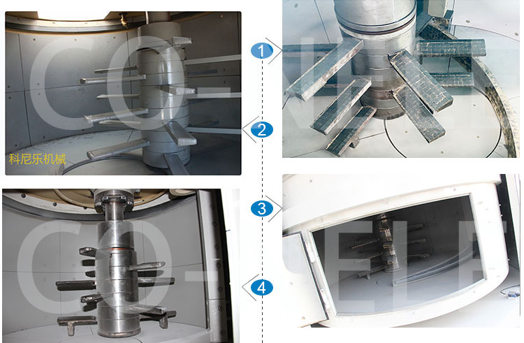 2、在旋轉(zhuǎn)的物料槽中,物料被送至刮板臂,后在刮板葉片的作用下翻轉(zhuǎn),促進了上下方向的宏觀混合。